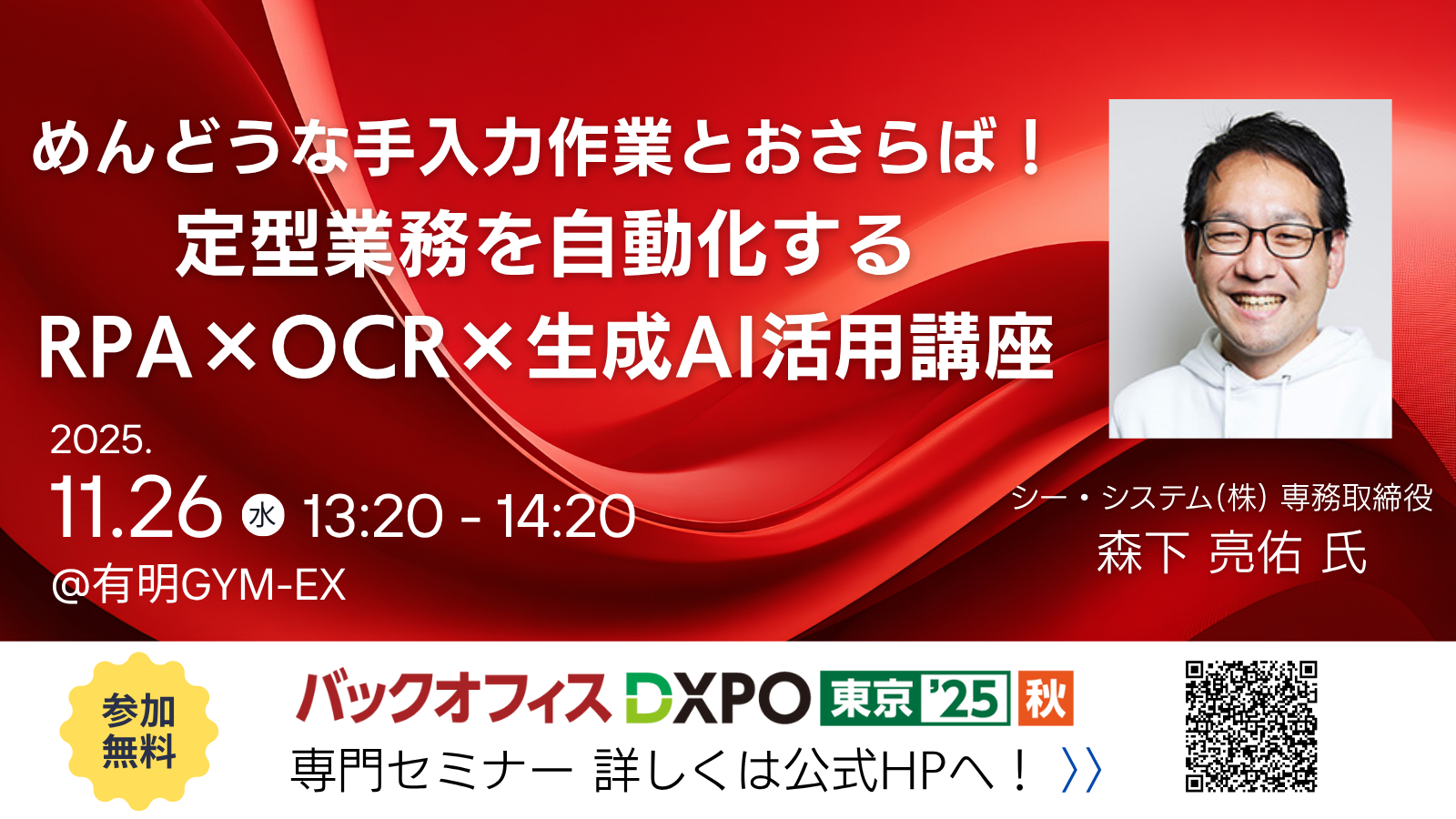 このたび、当社は11月26日(水)バックオフィスDXPO めんどうな手入力作業とおさらば!定型業務を自動化する RPA×OCR×生成AI活用講座 専門セミナー登壇で弊社の専務取締役 森下 亮佑が登壇することが決定しました。